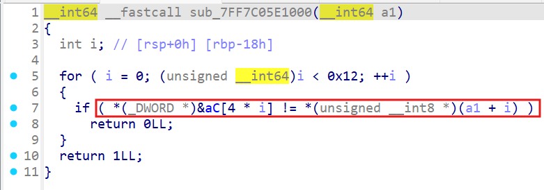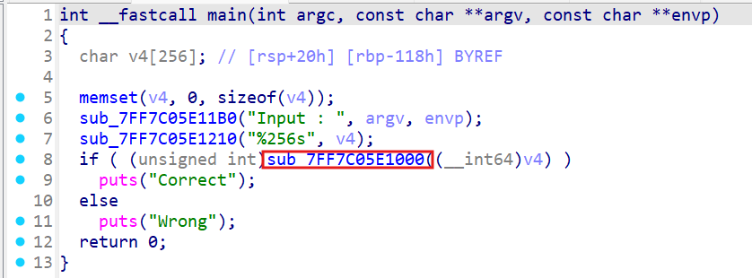 목적은 "Correct"를 하기 위해 "sub_7 FF7 C05 E1000"의 주소를 들어가 보자.