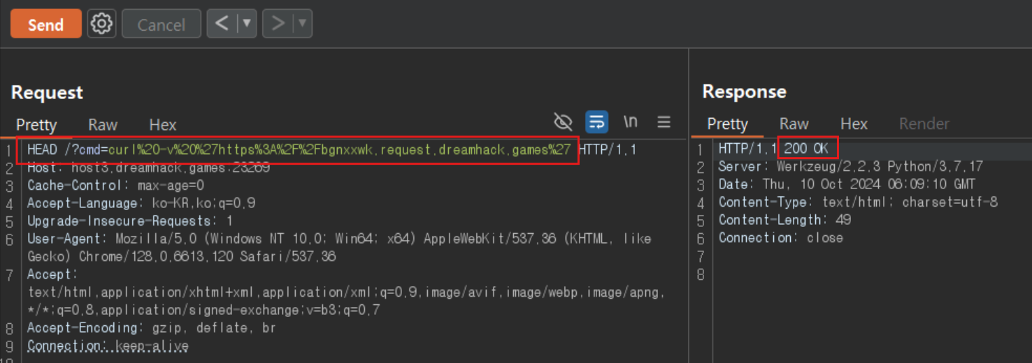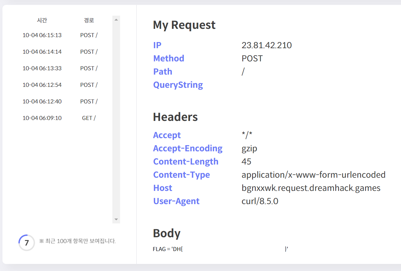 HTTP 응답정도밖에 듣지 못하기에 우리는 원격으로 보낸 코드에 대한 응답을 requestbin을 통해 들어야 한다.