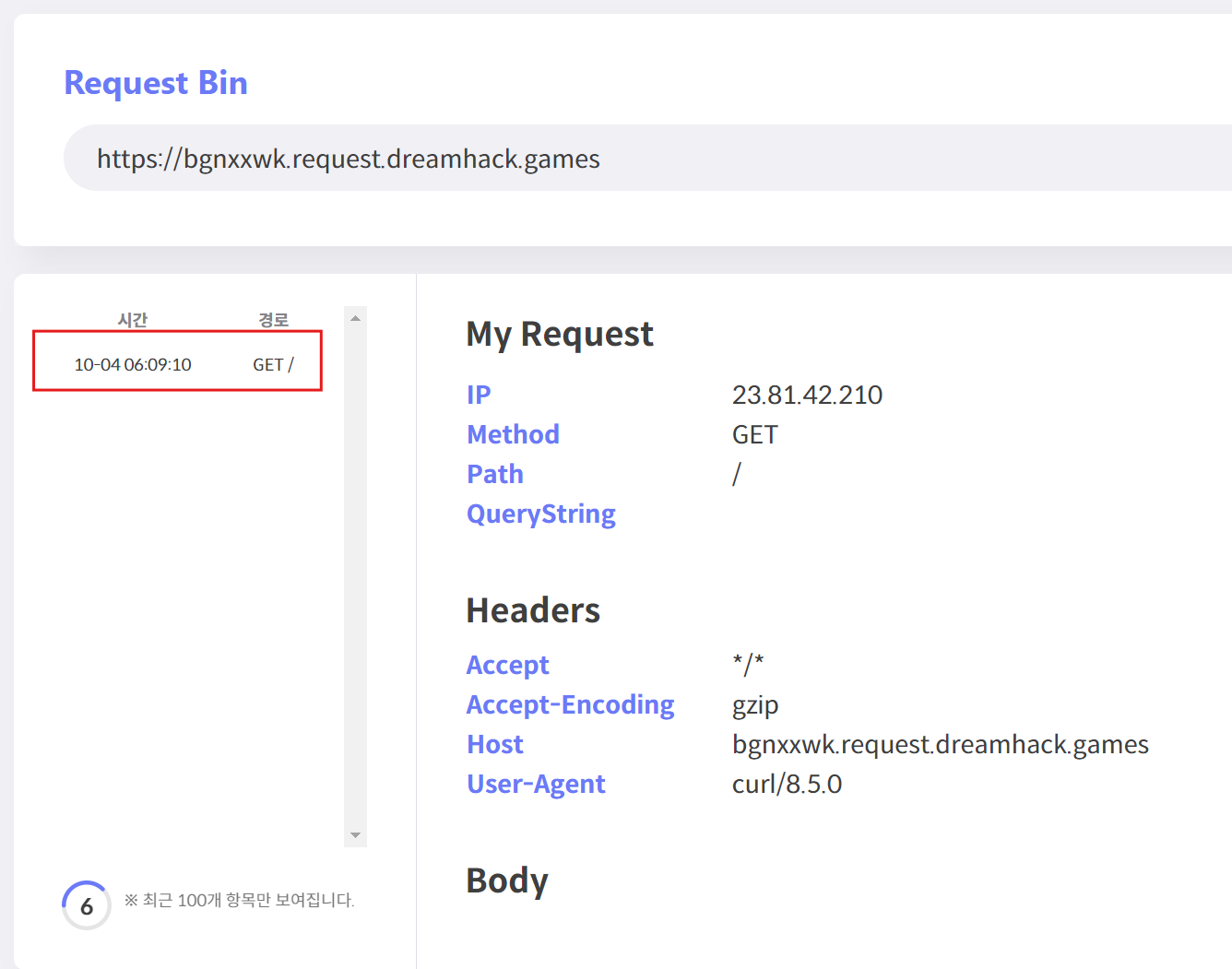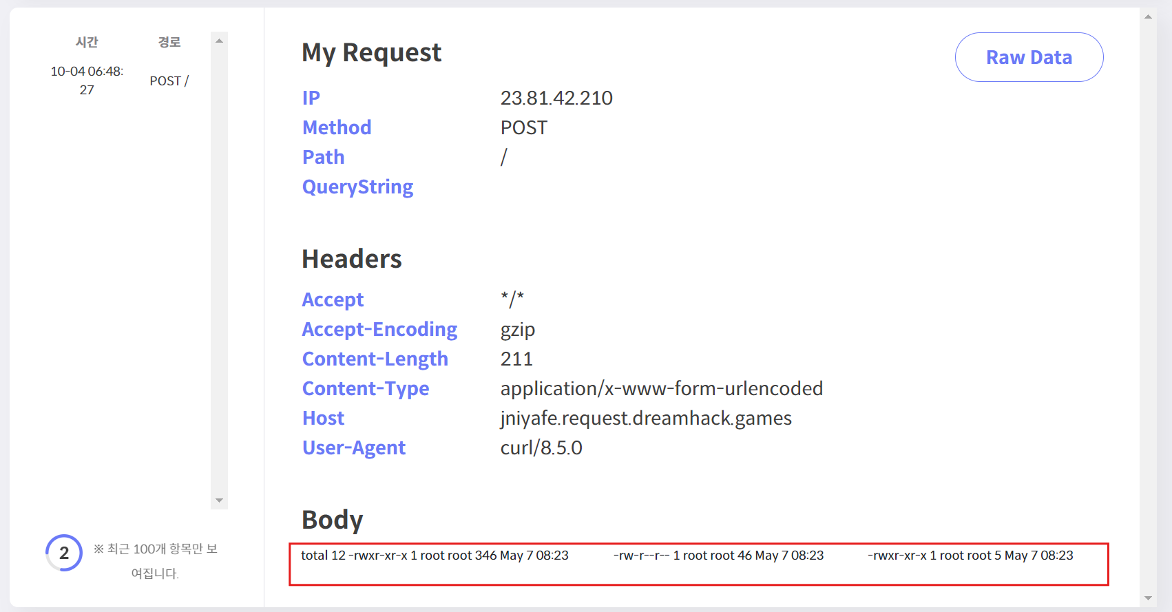 요청이 정상적으로 Request bin에 도착하여 데이터를 보여준다.