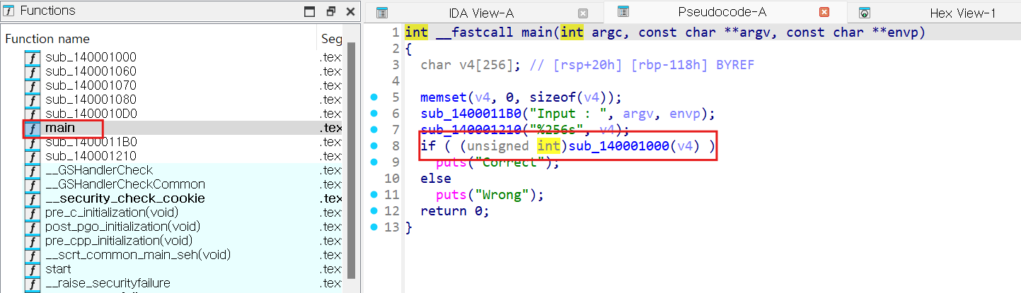 디컴파일링을 하고 'Corrcet' 를 출력시키기 위해 'sub_140001000' 한번 확인해 보자.