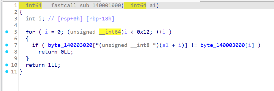 반복문을 0x12 만큼 하고 byte_140003020에 배열 값과 byte_140003000 배열값을 비교해서 맞는 값들만 출력하는 식인듯하다.