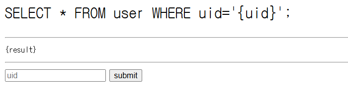 <pre style="font-size:200%">SELECT * FROM user WHERE uid='{uid}';</pre><hr/>