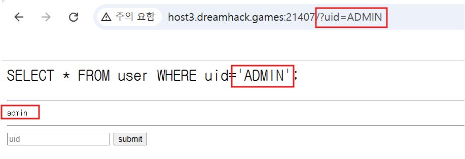 대문자 ADMIN을 입력하니 uid 가 잘 출력이 되고 있다