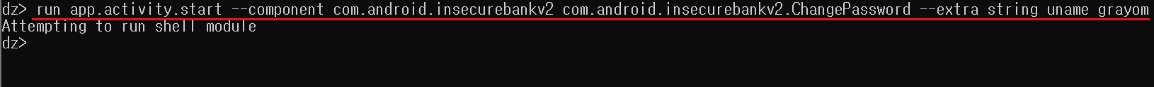 dz> run app.activity.start --component com.android.insecurebankv2 com.android.insecurebankv2.ChangePassword --extra string uname jack