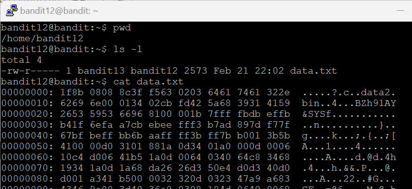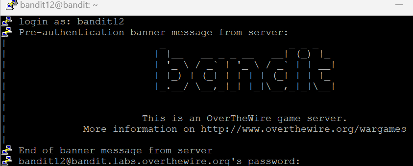 Level 11에서 가져온 키 값을 복사해서 bandit12에 접속해 보자.