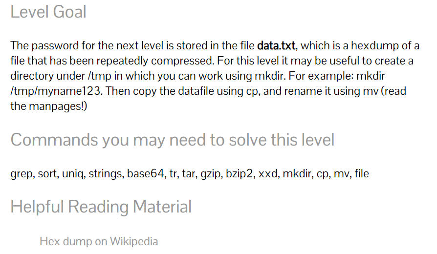쉽게 말하면 반복적으로 압축된 파일의 hexdump인 data.txt파일에 저장되어 있다.