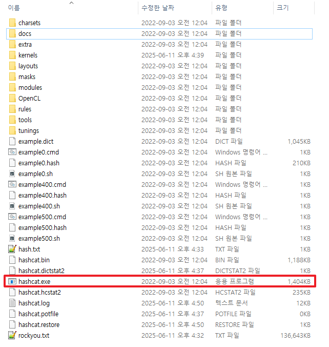 hashcat -m [해시모드] -a 0 [해시파일] [사전파일]