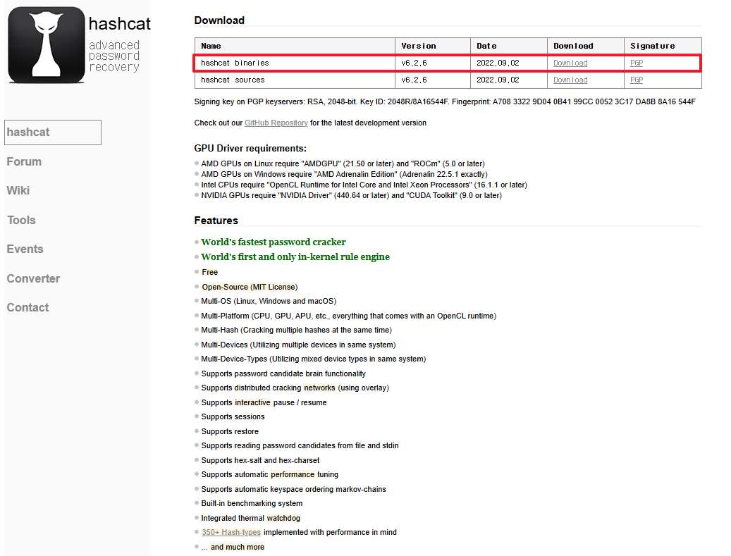 Download Name Version Date Download Signature hashcat binaries v6.2.6 2022.09.02 Download PGP hashcat sources v6.2.6 2022.09.02 Download PGP Signing key on PGP keyservers: RSA, 2048-bit. Key ID: 2048R/8A16544F. Fingerprint: A708 3322 9D04 0B41 99CC 0052 3C