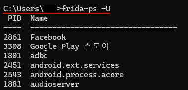 | 3. frida-ps | 연결된 디바이스에서 실행 중인 프로세스를 나열합니다. Android, iOS, Windows 모두 지원합니다. |