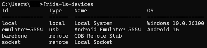 | 4. frida-ls-devices | 연결 가능한 디바이스 목록을 보여줍니다 (USB, local, remote, TCP 연결 등). |
