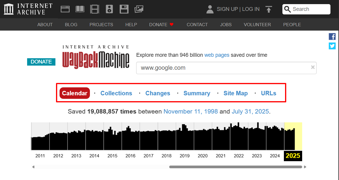 | Changes (변경 이력 비교) | 같은 페이지의 두 시점 간 차이점(diff)을 시각적으로 보여준다. (ex. 2021년과 2023년에 저장된 페이지를 비교하면 어떤 텍스트나 링크가 바뀌었는지 하이라이트로 보여준다.) |