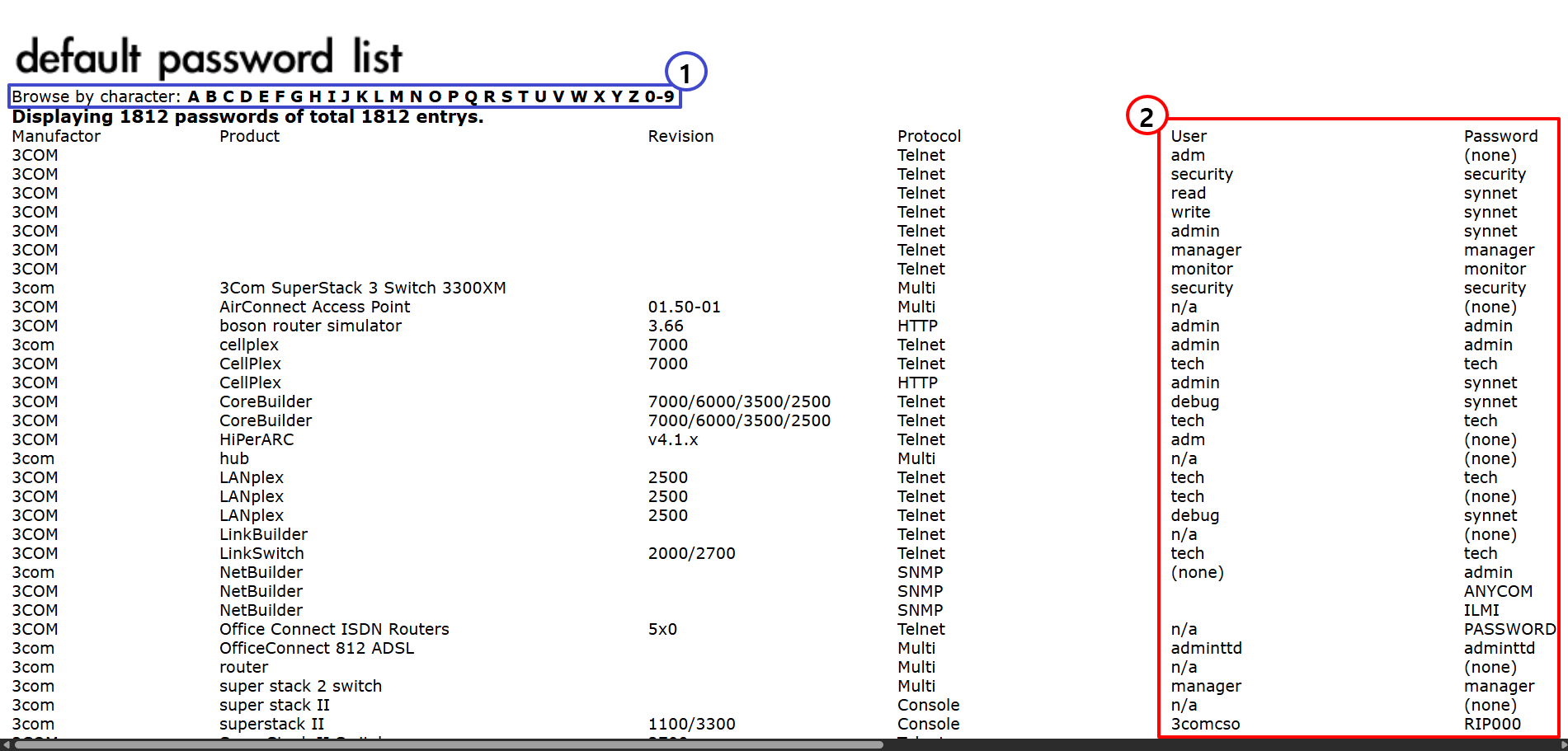 Browse by character: A B C D E F G H I J K L M N O P Q R S T U V W X Y Z 0-9 Displaying 1812 passwords of total 1812 entrys. ManufactorProductRevisionProtocolUserPasswordAccessValidated 3COM Telnet adm (none) No 3COM Telnet security security No 3COM Telnet
