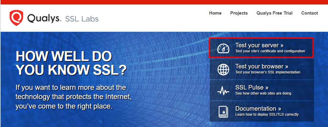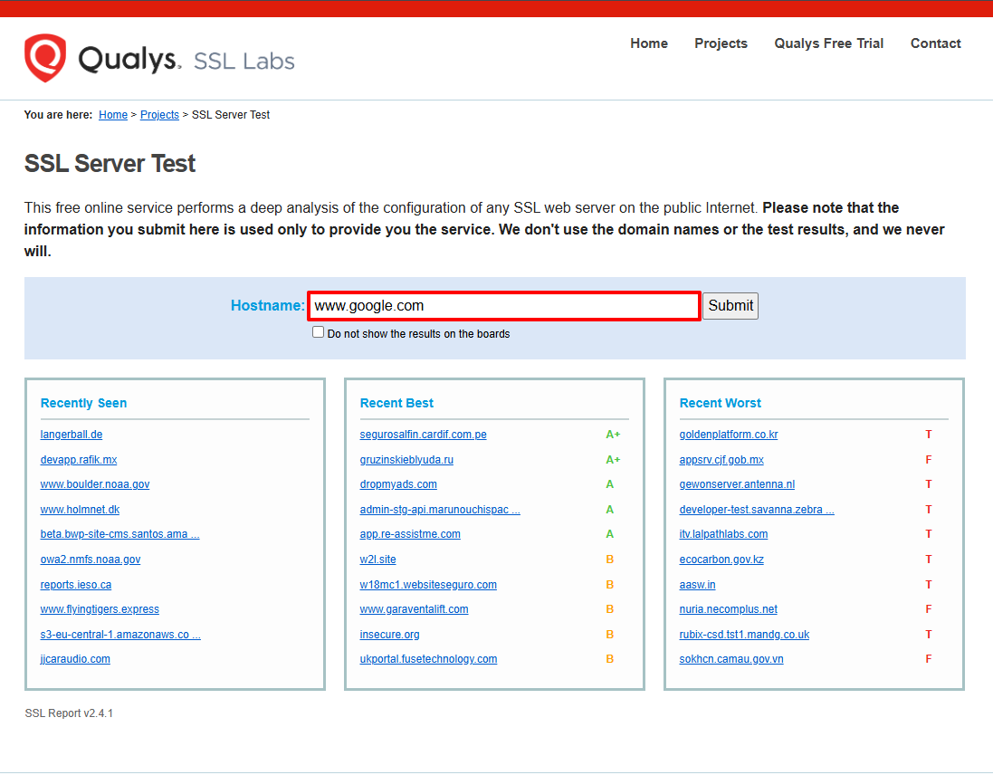 보안 기업 Qualys에서 제공하는 웹 서버 SSL/TLS 구성 진단 플랫폼으로, 인터넷상의 HTTPS 서비스 품질을 평가하기 위한 표준 도구처럼 널리 사용된다. 웹 서버의 인증서 설정, 프로토콜 지원 상태, 암호 스위트 구성, 취약점 존재 여부 등을 종합적으로 분석하여 A+부터 F까지의 등급으로 평가해 준다.