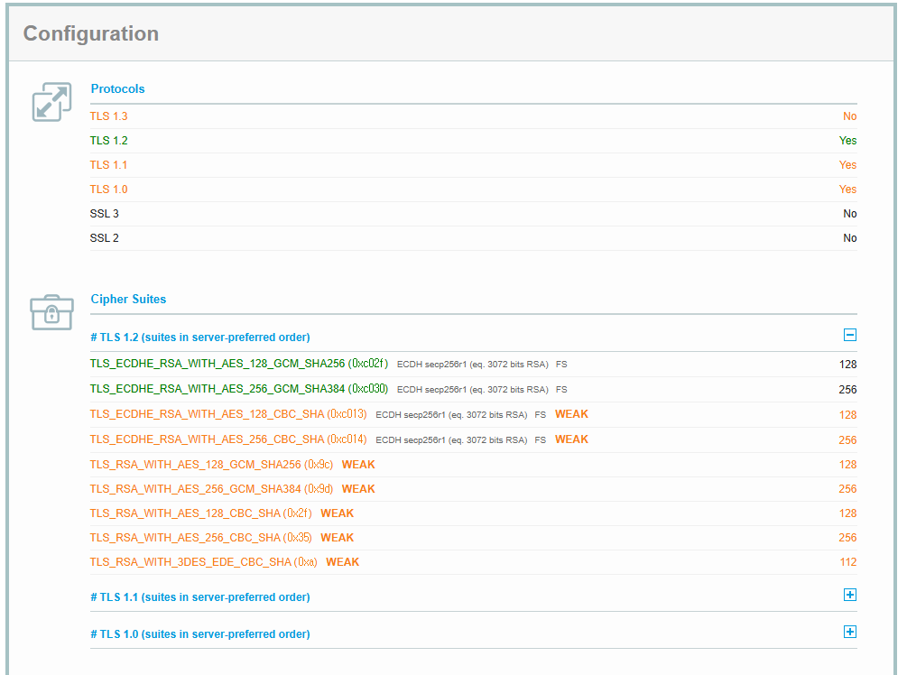 결과에 대한 발췌 목록들을 첫 번째로는 점수 평가가 나오고 어떤 프로토콜을 사용하는 어떤 암호 스위트를 사용하는지 등등 여러 가지 정보들이 보안 수준에 대한 표준화된 기준으로 한눈에 이해하기 편하기 나와서 좋은 플랫폼이라고 할 수 있다.