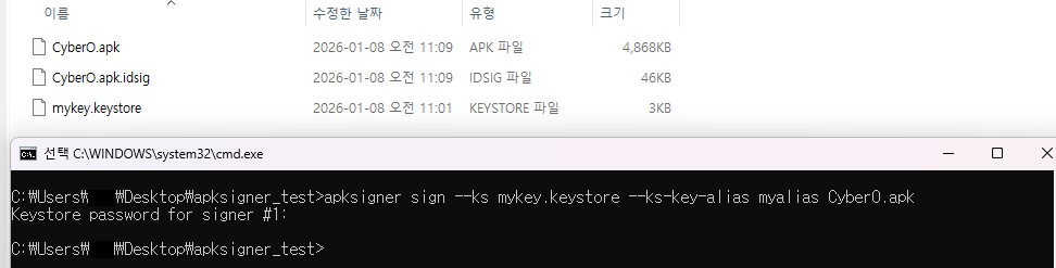 // mykey.keystore 안에 있는 myalias 개인키로 CyberO.apk에 서명하라