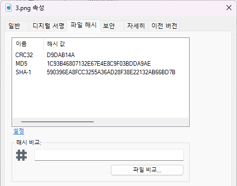 파일 우클릭 > 속성 > 파일해시 보면 확인할 수 있다.