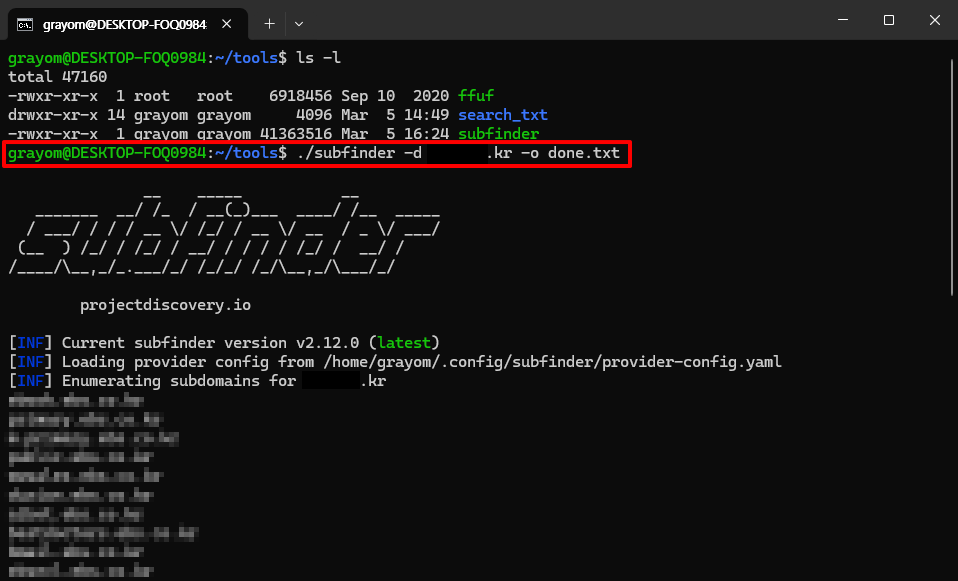 ./subfinder -d [타겟도메인] -o done.txt
