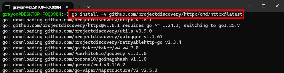 go install -v github.com/projectdiscovery/httpx/cmd/httpx@latest