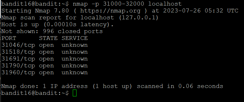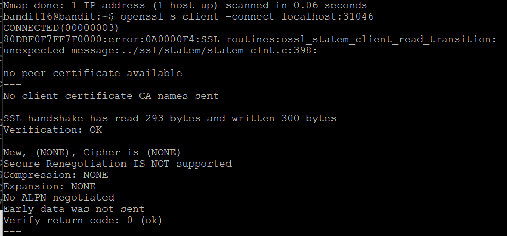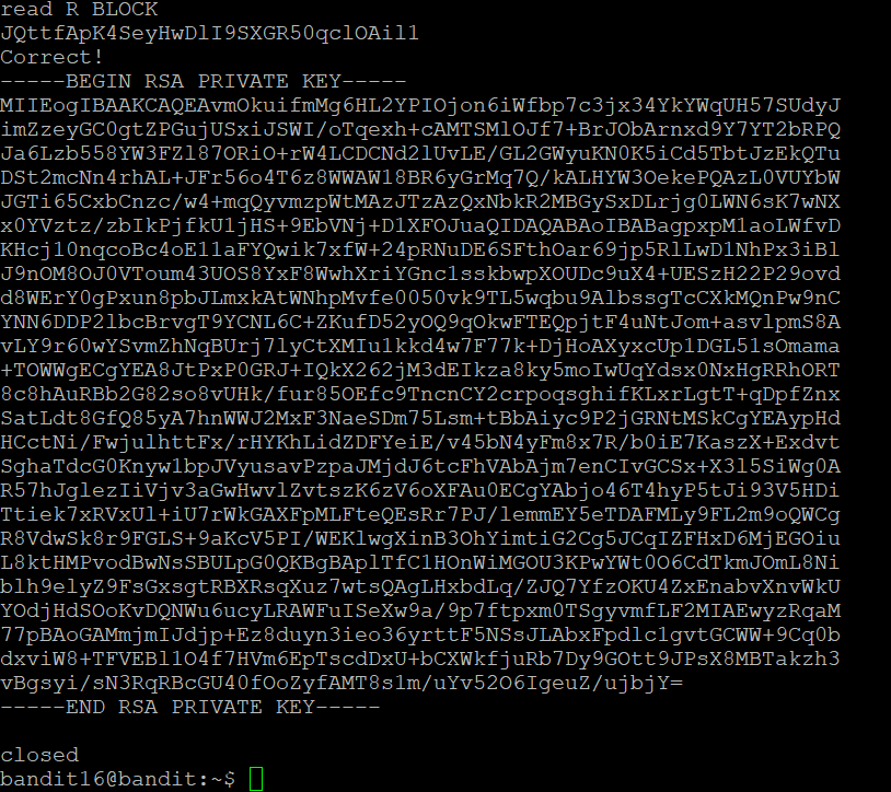 31790에 접속을 시도해 보자 'read R BLock'이 떠서 패스워드를 입력해 주었다. (bandit16 패스워드 입력해 주면 된다)