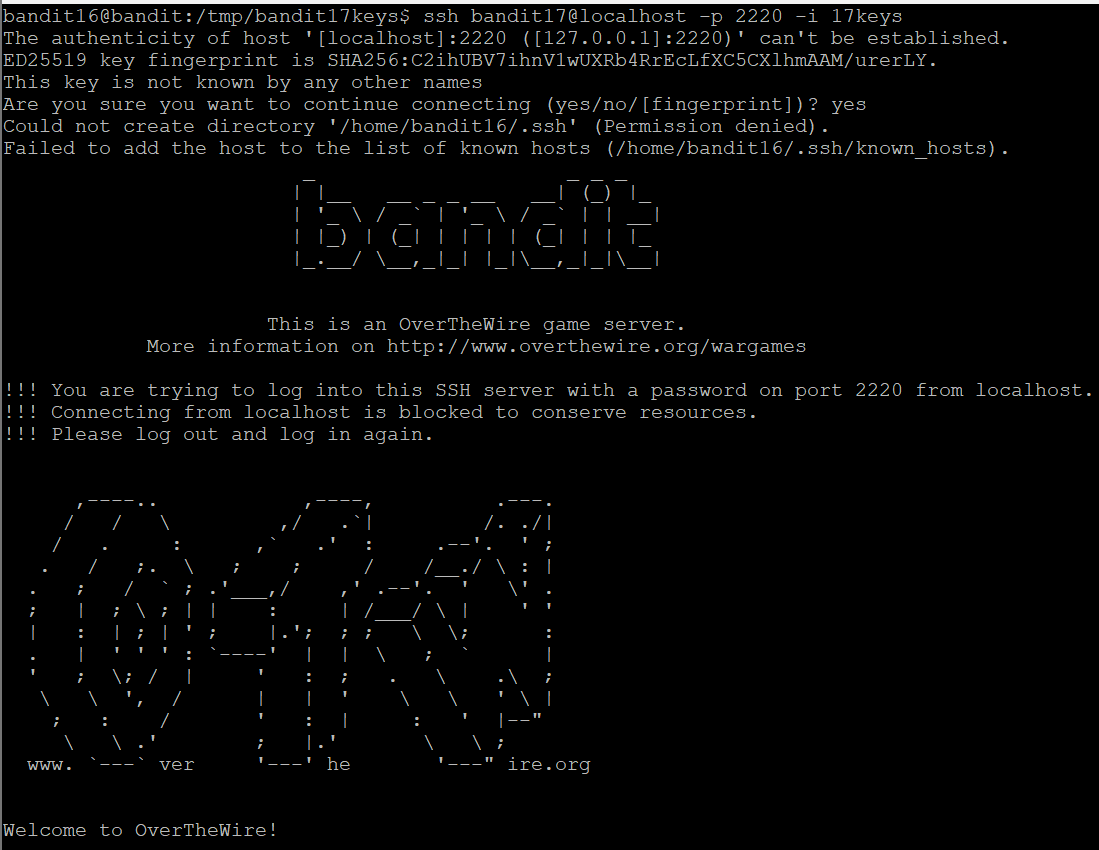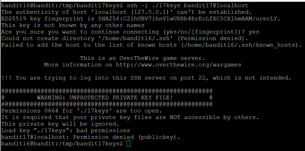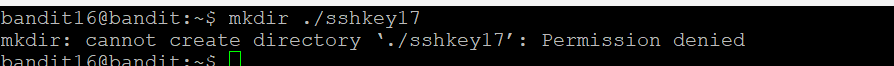현재 위치 bandit16에서 mkdir(디렉터리생성)을 하려고 했지만 거부되었다.