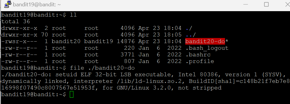 bandit20-do 는 setuid이다 즉 bandit20의 권한을 쓸 수 있는 키 같은 느낌이다.