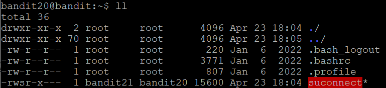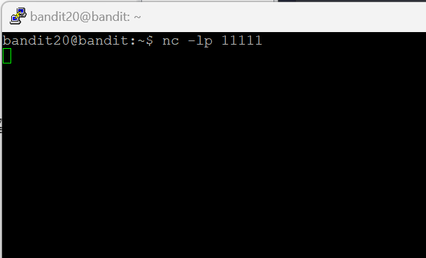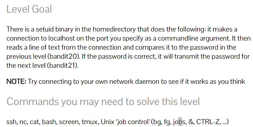 홈 디렉터리에 setuid 바이너리가 있다고 한다 포트를 열어서 localhost에 연결을 생성하고 bandit20 비밀번호를 전송하면 bandit21의 비밀번호를 준다고 한다. 그러면 일단 접속부터 하고 포트를 한번 열어보자.