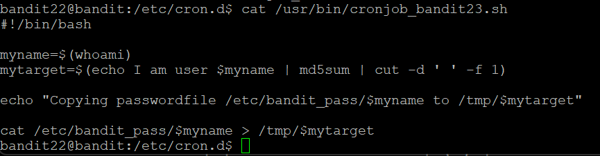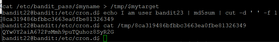 I am user bandit23을 md5 sum 암호화시키고 ' ' 공백을 다 제거 후에 mytarget 변수에 저장한다고 생각하면 된다