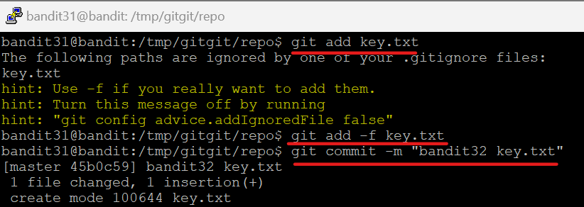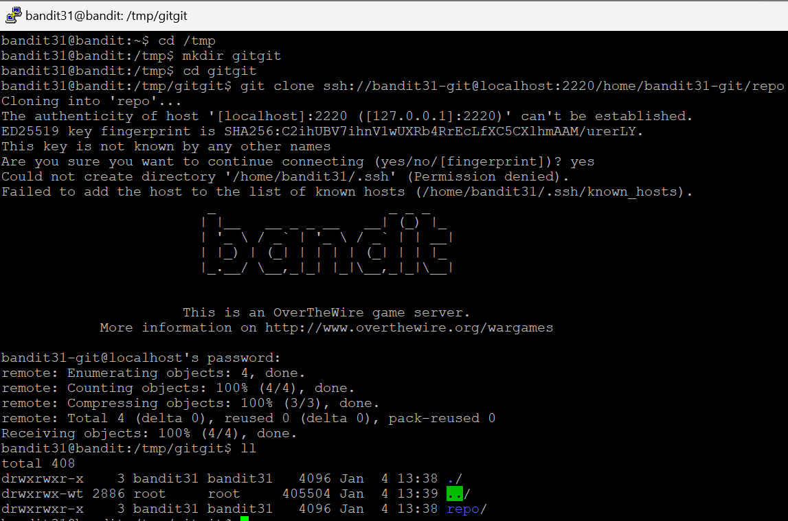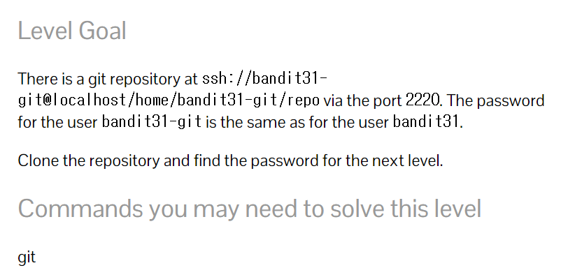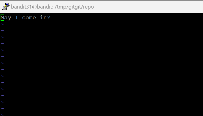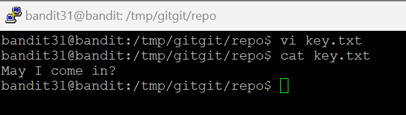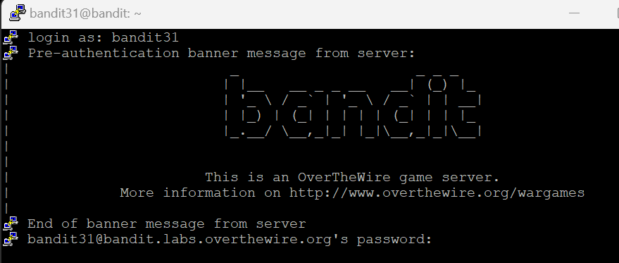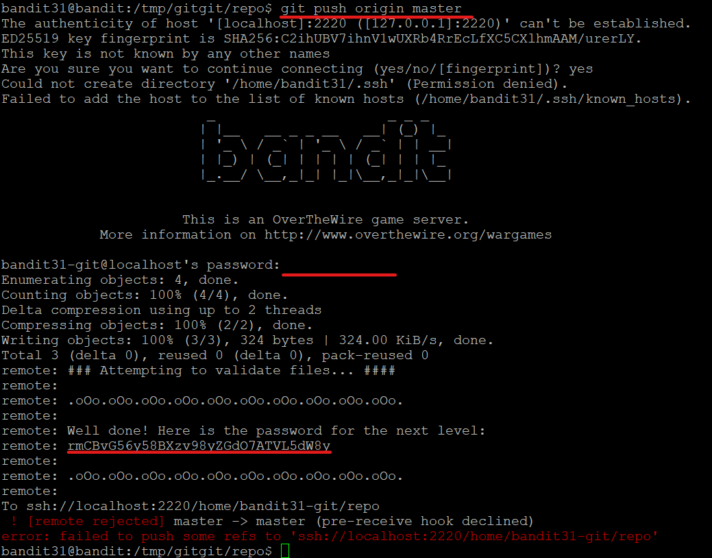 아까 README에 나온 그대로 master 브랜치에 push 해 보도록 하자 그러면 bandit31 password를 물어보고 입력하면