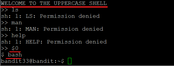 $0를 입력하여 bash 쉘을 키니 바로 bandit33으로 되는 걸 확인할 수 있다.