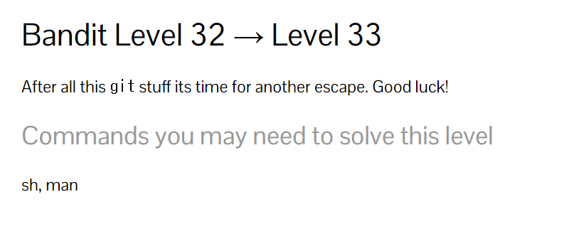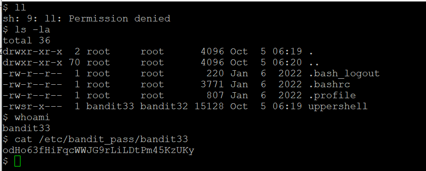 이렇게 굳이 bash를 실행하지 않아도 '$' 상태만으로도 bandit33이라서 패스워드를 확인할 수 있다.