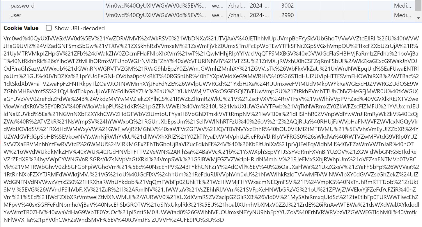 위 코드를 보면 'guest' , '123 qwe'를 base64로 20번 인코딩하고 문자열(숫자) 들을 특수기호로 치환하여 쿠키값을 저장했음을 알 수 있다 그러면 현재 쿠키를 한번 살펴보자.