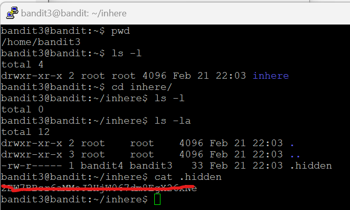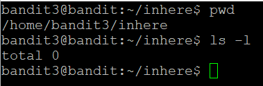 ls - l를 이용해서 bandit3이라는 디렉터리 안에 inhere이라는 디렉터리가 있다는 것을 확인