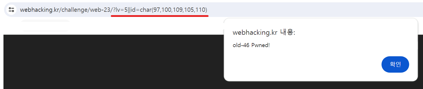 https://webhacking.kr/challenge/web-23/?lv=5||id=char(97,100,109,105,110)