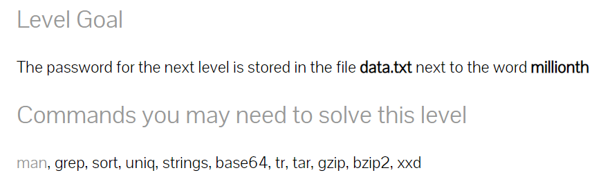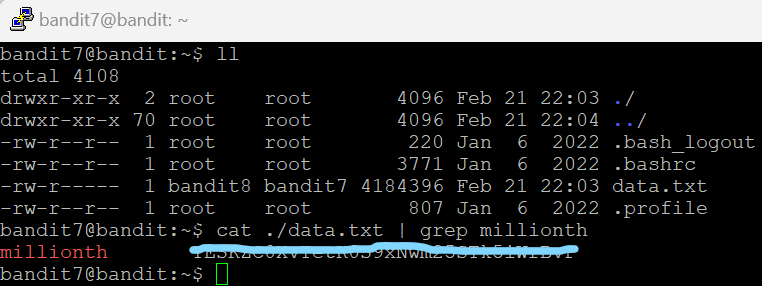 다음 레벨 비밀번호는 'data.txt' 안에 'millionth' 단어 옆에 키 값이 존재한다고 한다.