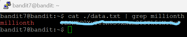 여기서는 'grep' , '|' (파이프) 를 쓰면 간편하게 끝낼 수 있다 cat 명령어는 전에 bandit시리즈에서도 많이 나왔으니까 다 알 거라고 생각합니다